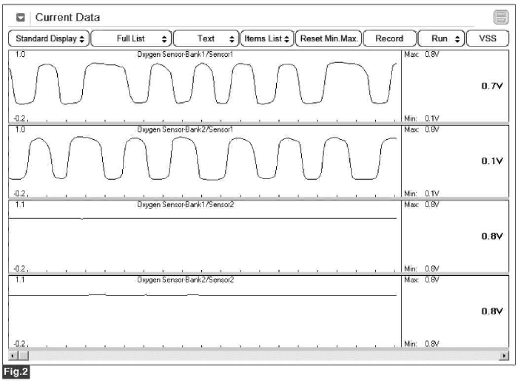 Fig 1) Normal waveform of front HO2S (Sensor 1) and rear HO2S (Sensor 2).