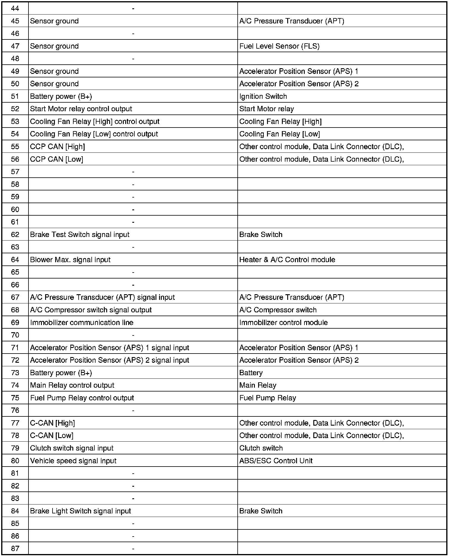 ECM Terminal Input/Output signal (AT)
