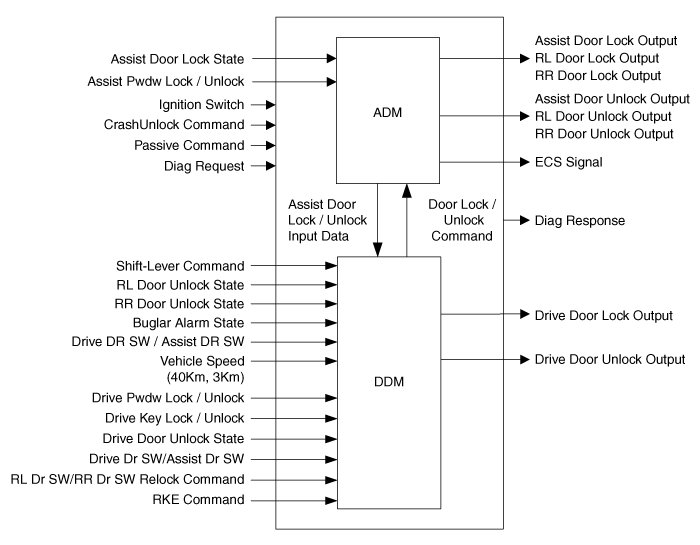 - Power Window Inhibition : ADM, RLDM and RRDM are inhibited by Power window Lock Switch