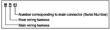 A Connector identification symbol consists of a wiring harness location classification symbol corresponding to a wiring harness location and number corresponding to the connector.