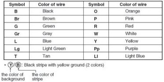 The following abbreviations are used to identify wire colors in the circuit schematics.