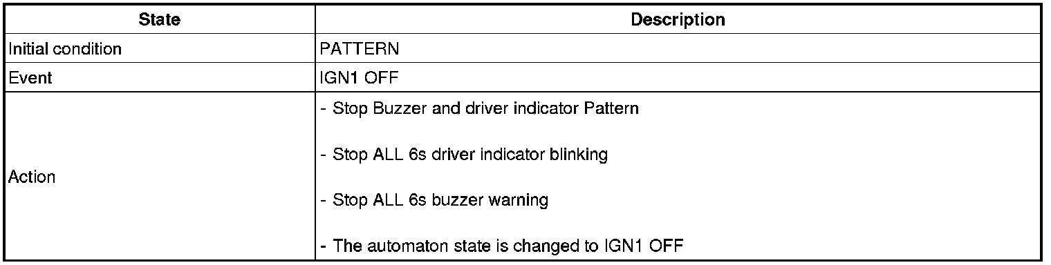 In the state that the IGN1 is ON or the Parking Brake is pulled, if the speed of vehicle is maintained over 10 km/h for 2 - 3 seconds or more, then the Chime Buzzer output shall be continued with 1 second cycle of the ON/OFF (0.3/0.7 seconds). But, after the speed of vehicle is maintained over 10 km/h for 2 - 3 seconds or more, if the Parking Brake is pulled, output immediately.