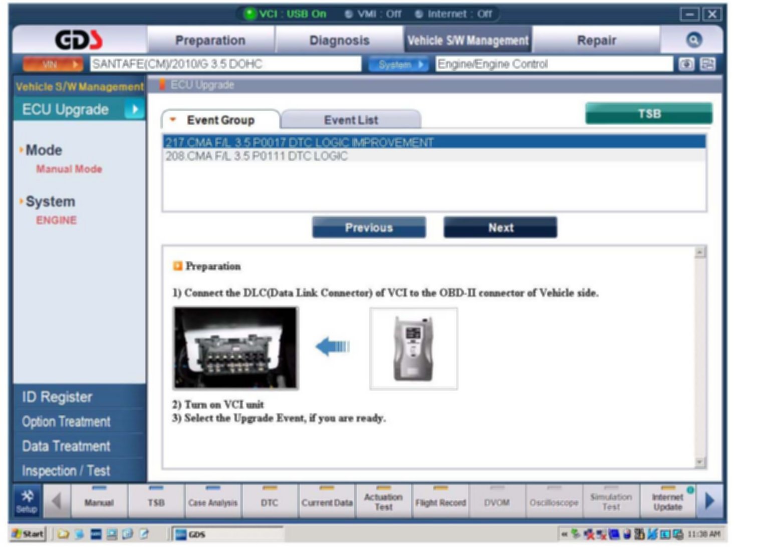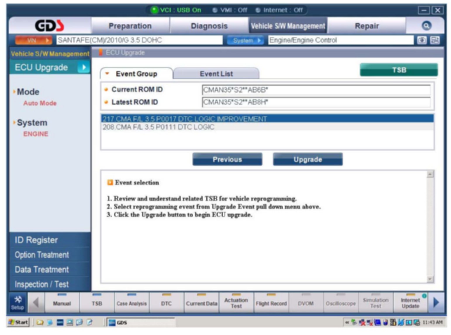 5. Update 217 CMA F/L 3.5 P0017 DTC Logic Improvement is displayed. Click Upgrade.