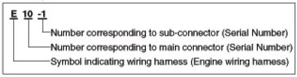 A Connector identification symbol consists of a wiring harness location classification symbol corresponding to a wiring harness location and number corresponding to the connector.