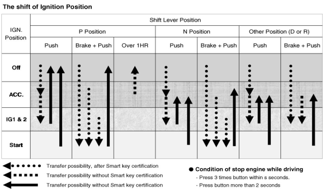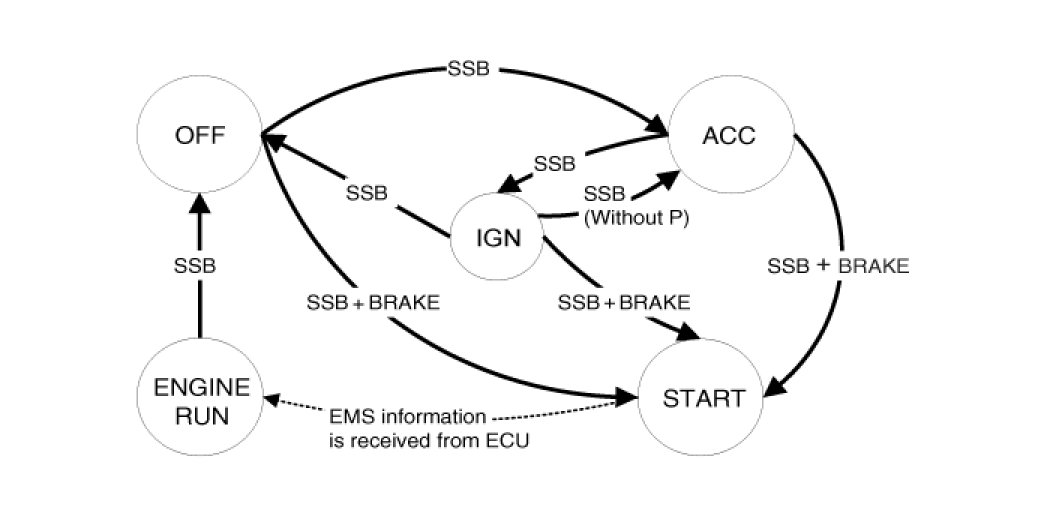 The one of distinction with Mechanical-Ignition-Switch based system is that the BES system allows specific transition from [OFF] to [START] without going through [ACC] and [IGN] states.