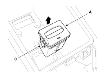 3. Disconnect the connector (B), then remove the fob holder assembly (A) after releasing the hook (C).