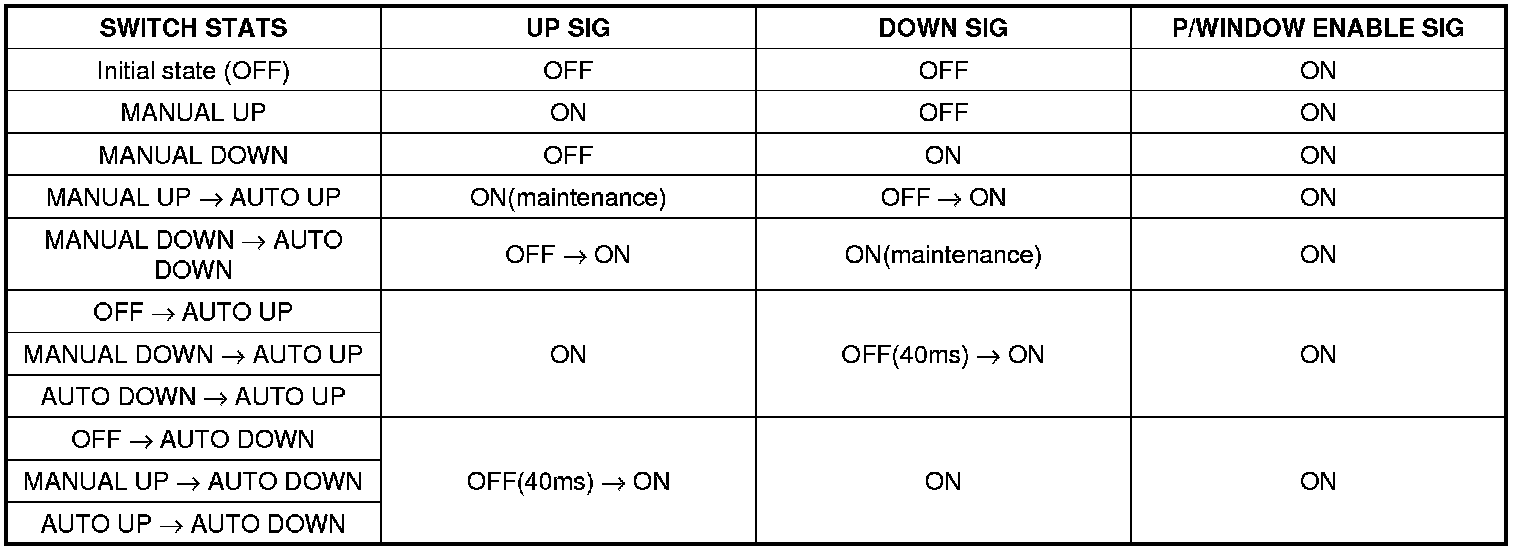 * At POWER WINDOW TIMER ( FROM BCM ) OFF & IGN 2 (DDM) OFF, independently of SWITCH s' state UP SIGNAL and DOWN SIGNAL are OFF state preservation.