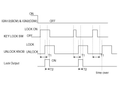 1. In case of KEY LOCK SWITCH becomes ON in OFF, driver seat UNLOCK KNOB is LOCK state or becomes LOCK in UNLOCK within 3 seconds and when IGN1 OFF ( FROM BCM ) & IGN2 OFF ( FROM BCM ) & is IGN2 OFF ( DDM itself ), achieve LOCK. (T 1 : 3S ± 500 mSs, T 2:0.5s ± 100 mSs)