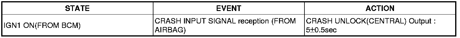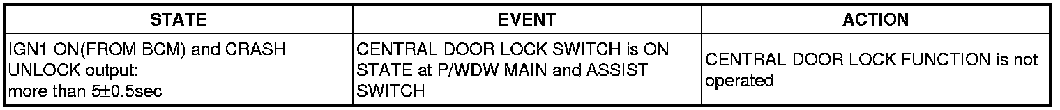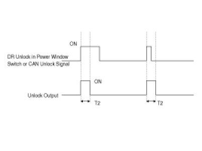 * At DR LOCK in POWER WINDOW SWITCH or CAN LOCK signal reception,With UNLOCK KNOB state independently Lock output Display during 0.5S ± 0.1 secs. At DR UNLOCK in POWER WINDOW SWITCH or CAN UNLOCK signal reception Offer an Unlock output during 0.5 ± 0.1 secs independently with UNLOCK KNOB state. (IGN 1/2 input disregard)