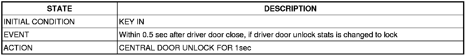 (1) When the IGN1 is ON, if the vehicle speed is changed over 40km/h from under (the signal shall be transferred to CAN from BCM), and if one door lock switch of the all door lock switch (FL, FR, RL, and RR) is UNLOCK, then the LOCK signal shall be output. (0.5±0.1 sec), If one door lock switch of the all door lock switch (FL, FR, RL, and RR) is UNLOCK after LOCK signal is output, the LOCK OUTPUT (ON for 0.5±0.1sec, OFF for 0.5±0.1sec) shall be output at most 3 times (totally 4 times).