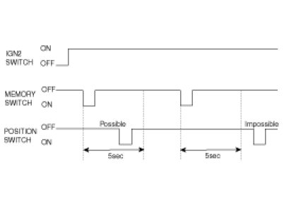 (1) If the position switch (POS1 or POS2) within 5 seconds after the memory switch is pushed at the ON state of the IGN2 (the switch module shall send the state signal through LIN), the present mirror position shall be memorized. (The 5-second duration from the ON state of the memory switch is the memory allowance period so that the allowance state shall be released if the 5 second duration is passed. That is, if the position switch (POS1 or POS2) is ON during the memory allowance period, then the present position shall be memorized.) Except, when the mirror manual switch at the LH is operated, the mirror position at RH shall not be memorized.
