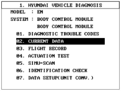 3. Select "Current data", if you will check current data of BCM. It provides power supply status, multi function status, lamp status, door status, lock system status, wiper, auto light status and so on.