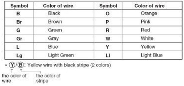 The following abbreviations are used to identify wire colors in the circuit schematics.