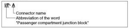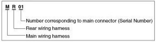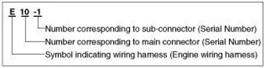 A Connector identification symbol consists of a wiring harness location classification symbol corresponding to a wiring harness location and number corresponding to the connector.