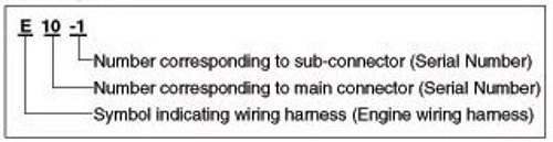A Connector identification symbol consists of a wiring harness location classification symbol corresponding to a wiring harness location and number corresponding to the connector.