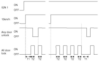1. ALL DOOR LOCK signal is output if vehicle speed is 15km/h within T1 under IGN1 ON && Alt L ON. But ALL DOOR LOCK, All DOOR LOCK signal is not output if all DOOR is LOCK or ALL DOOR are FAIL.