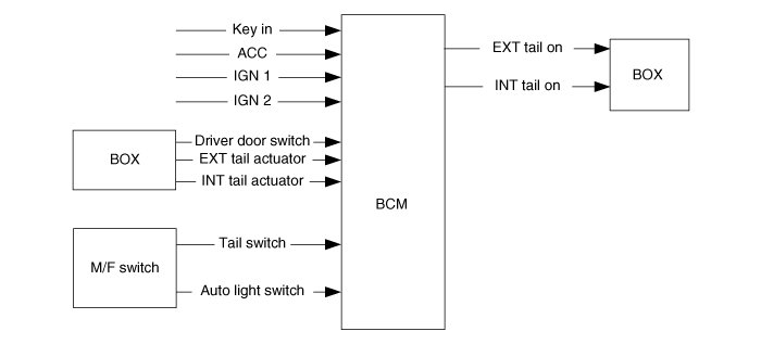 The "Tail Auto Cut" strategy ensures that Tail lamps are turned off even if a driver forgets to turn them off. When the Tail lamp is turned on by Tail lamp switch, after key insertion , and if a user removes key and opens the driver side door(or vice versa), the Tail lamps are automatically turned off. While "Tail Auto Cut" function is active, if a user turns off the Tail lamp switch or inserts key, "Tail Auto Cut" function will be deactivated and Tail lamps can be turned on.