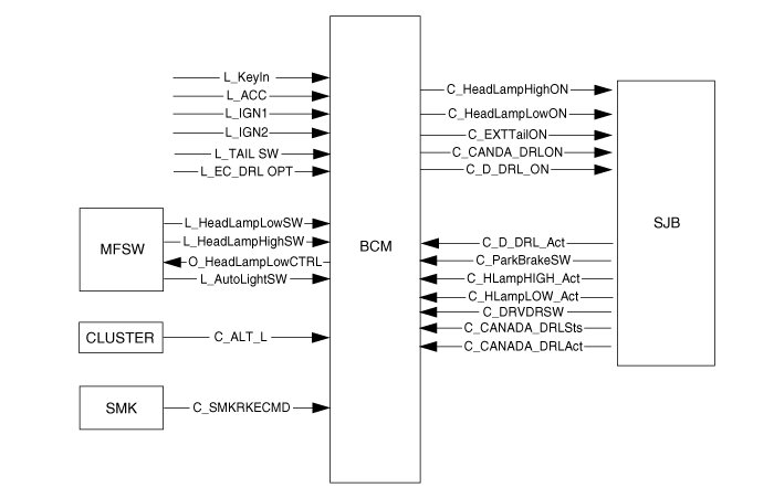 A. If alternator level is high(ALT L=On), BCM activates Canada DRL functionality and turns on the Head lamp high (CANADA DRL=On).