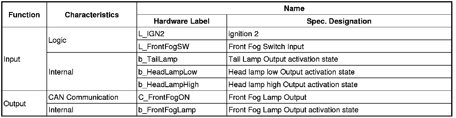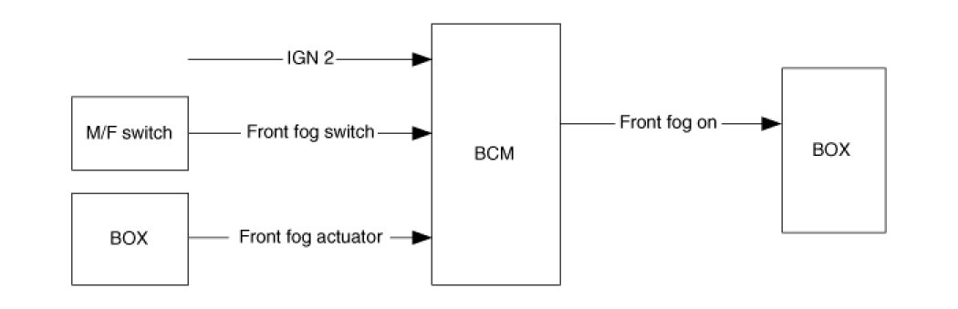 (1) In case of (IGN2=ON) & (HeadLampLow=ON) & (HeadLampHigh=Off), if Front fog lamp switch input is detected (FrontFogSW=On), Front fog lamp output (FrontFogON=On) is turned ON.