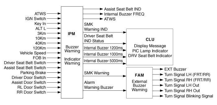 In case of Driver side 6sec Indicator, the cluster module operates it after receiving 'Driver Seat Belt Indicator Status' from the IPM. So if the IPM sends 'Driver Seat Belt Indicator Status = blinking' over 6sec then the IPM sounds buzzer warning one more time.