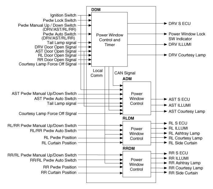 - Driver Power window Enable, Driver Power window Up, Driver Power window Down transmits the control signals (the status of ADM switch on DDM and Power window Inhibit) to ADM via CAN