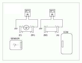 - Disconnect connector (B), and measure for resistance between connector (C) and (B1) and between (B2) and (A) as shown in [Fig 3].
