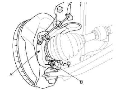 4. Remove the split pin and front lower arm mounting bolt (B) from the knuckle (A).
