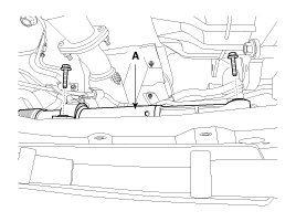 12. Remove the sub frame stay mounting bolts (A), nuts (B) and the sub frame mounting bolts (C) by supporting it with a jack.