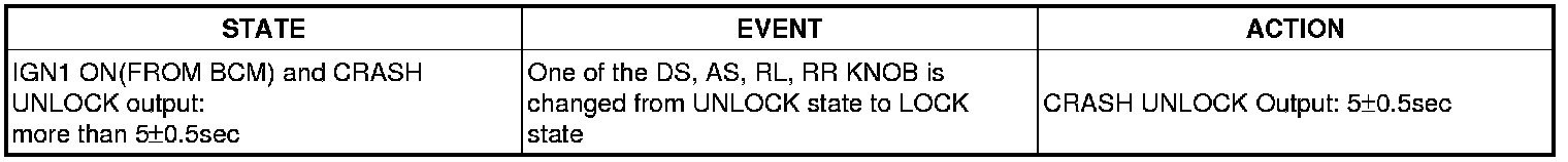 * At DR LOCK in POWER WINDOW SWITCH or CAN LOCK signal reception,With UNLOCK KNOB state independently Lock output Display during 0.5S ± 0.1 secs. At DR UNLOCK in POWER WINDOW SWITCH or CAN UNLOCK signal reception Offer an Unlock output during 0.5 ± 0.1 secs independently with UNLOCK KNOB state. (IGN 1/2 input disregard)