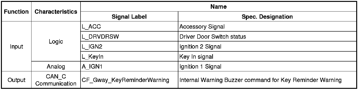 If driver opens the driver side door and go away from the car during key is inserted or ACC state, a sound warning reminds a driver that key has to be taken off or ACC state has to be changed to Off state.