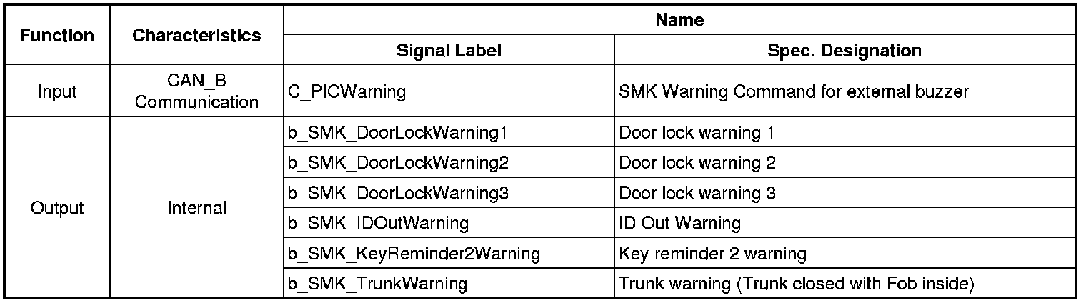 SMK System Warnings conditions of activation are controlled by the SMK unit. When a condition is satisfied, SMK unit sends corresponding warning request to IPM and cluster by CAN, IPM only operates the external buzzer. Internal Warning Buzzer or Warning Indicator are operated by the Cluster.(refer the SMK warning specification.)