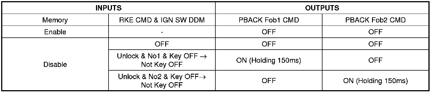 DDM transmits one of Fob1, and Fob2 Playback Start command to ADM via can communication when As for DDM, it starts Playback with last received the fob command when becoming IGN SW DDM =Key Off -> Not Key Off in the condition which is necessary for Fob Playback Enable Mode after sending a corresponding Playback command (after ADM receives Playback command from DDM ).