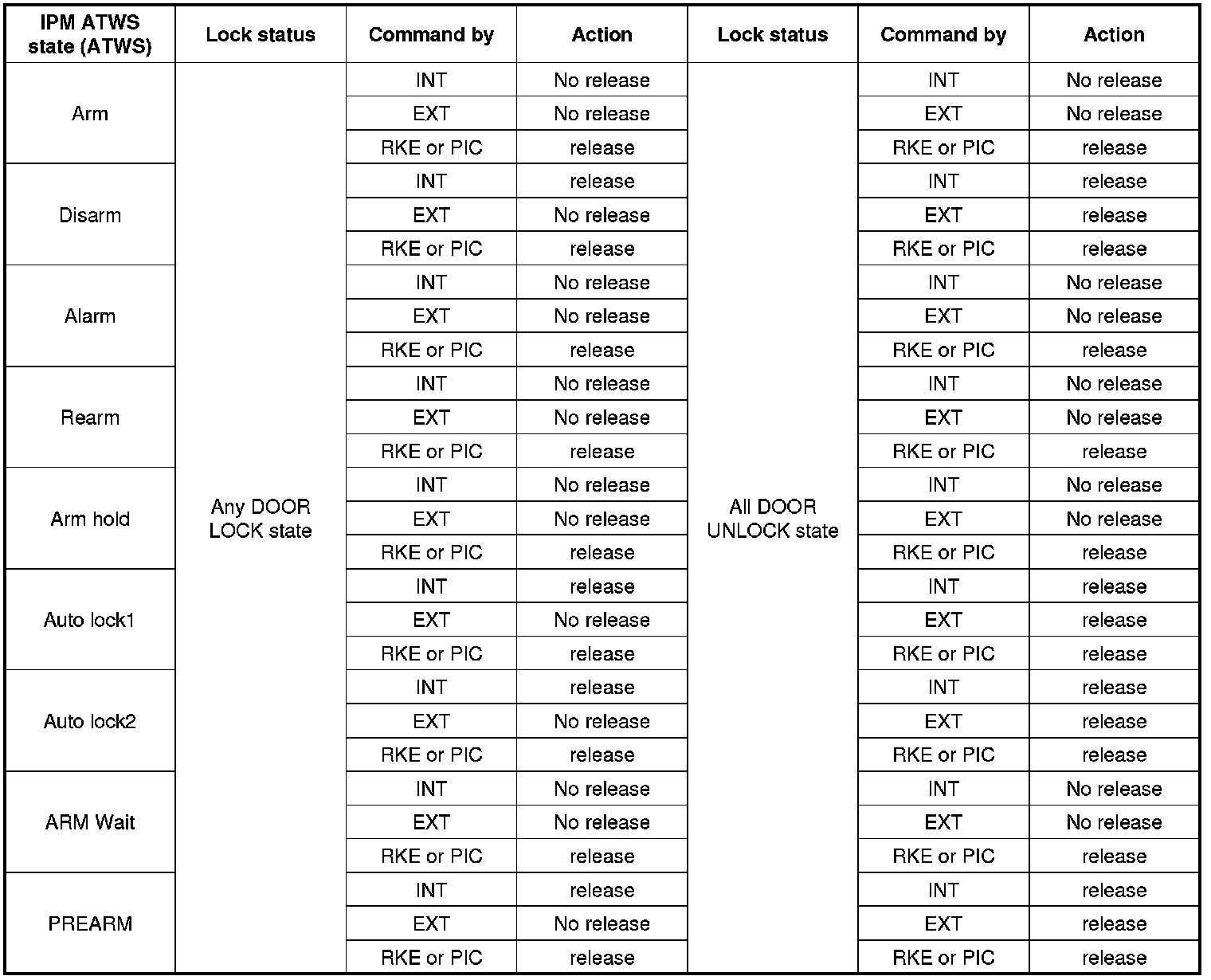 B. During Trunk is opened state, if the IPM receives the Trunk release command from door module via CAN, External Trunk Open SW then the IPM does not take trunk release action, but if the command comes from RKE or in case of PIC variant: from PIC as a passive trunk command then the release action is performed anyway.
