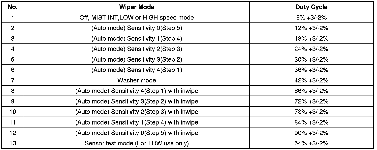 No Input Signal Present is asserted when the Sensor cannot detect a usable input signal from the wiper control for a minimum of 0.5 seconds.