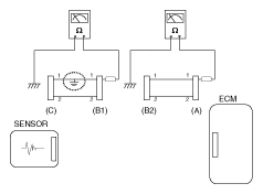 - Disconnect connector (B), and measure for resistance between connector (C) and (B1) and between (B2) and (A) as shown in [Fig 3].