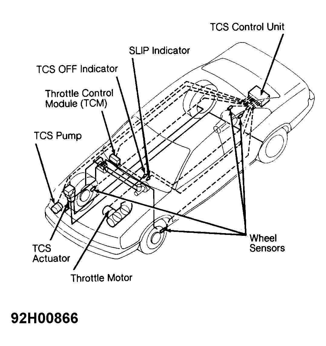 Throttle Control Module (TCM), mounted on front passenger side steering member, receives signals from TCS control unit. See Figure