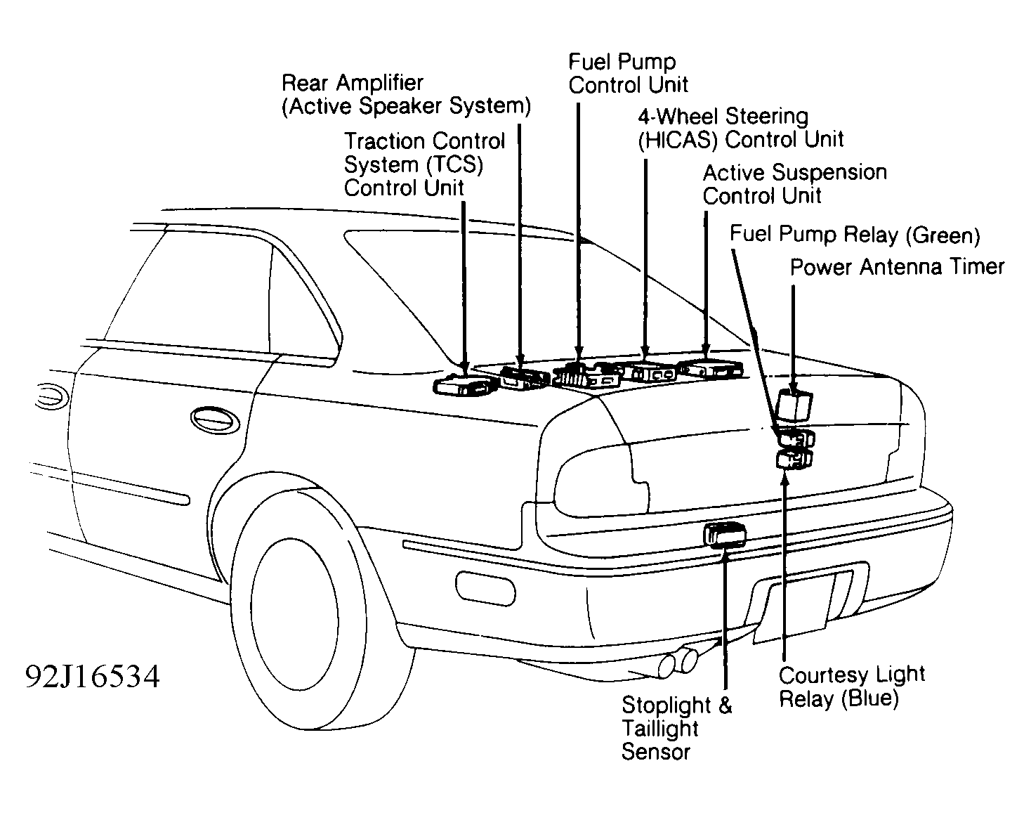 | 4-Wheel Steering (HICAS) Control Unit | Under right rear package tray. See Figure . | |