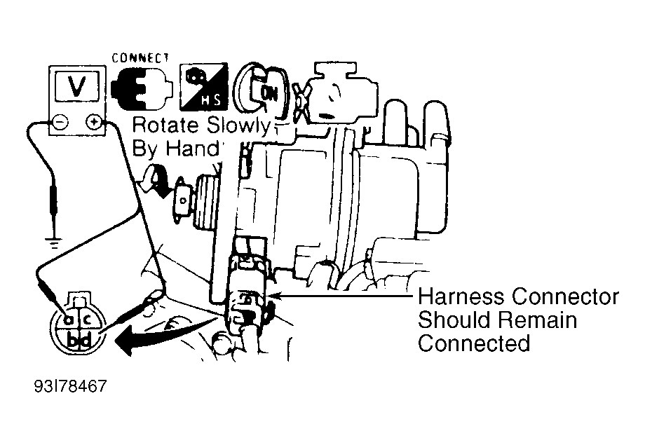 - Connect negative lead of an analog voltmeter to ground. Rotate crank angle sensor shaft slowly by hand. Connect positive voltmeter lead to crankshaft position sensor connector terminal "a" (180-degree signal). See Fig 1