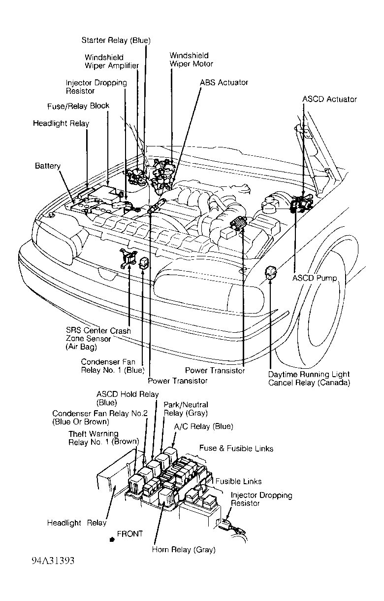 | Fuse/Relay Block (Engine) | In right front side of engine compartment, near battery. See Figure . | |