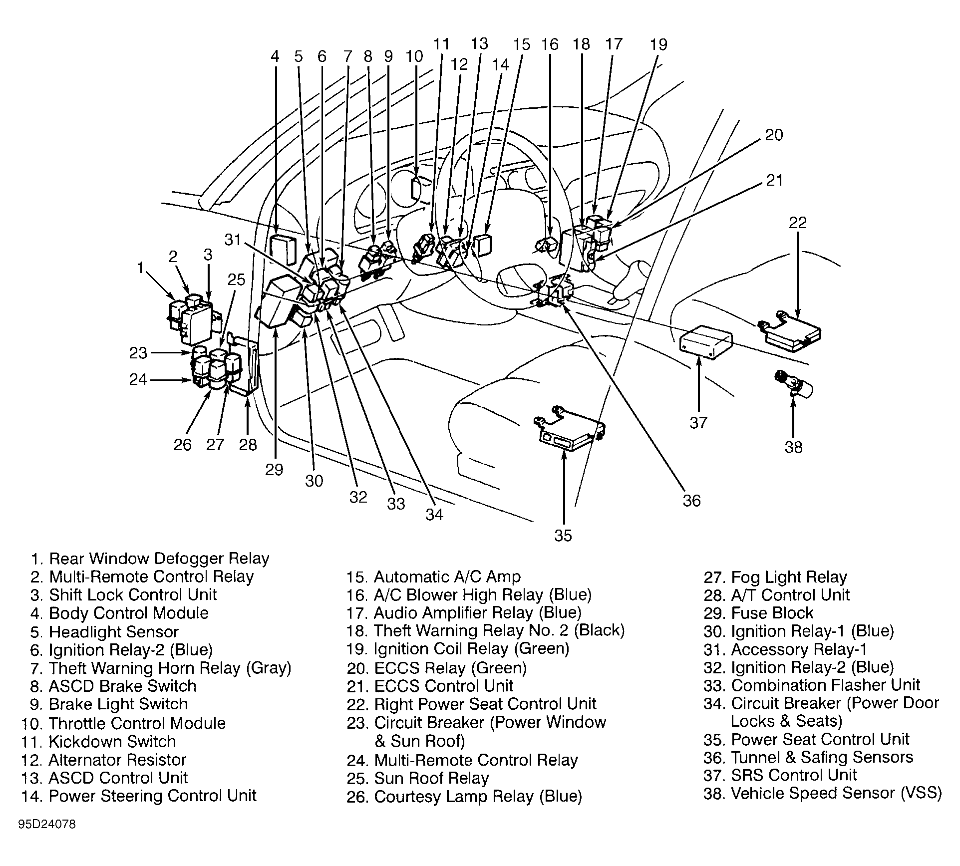 | Power Window & Sun Roof | Behind left kick panel. See Figure . | |