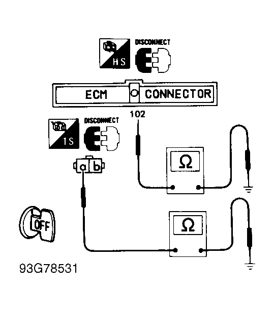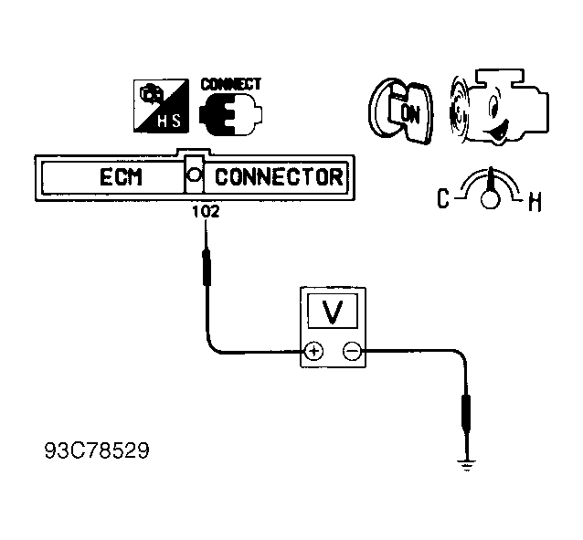 If vacuum is not present, with engine running, measure voltage between ECM terminal No. 102 (Red/Black wire) and ground. At idle, voltage should be zero volts. At 2000 RPM, voltage should be battery voltage. See Fig 2