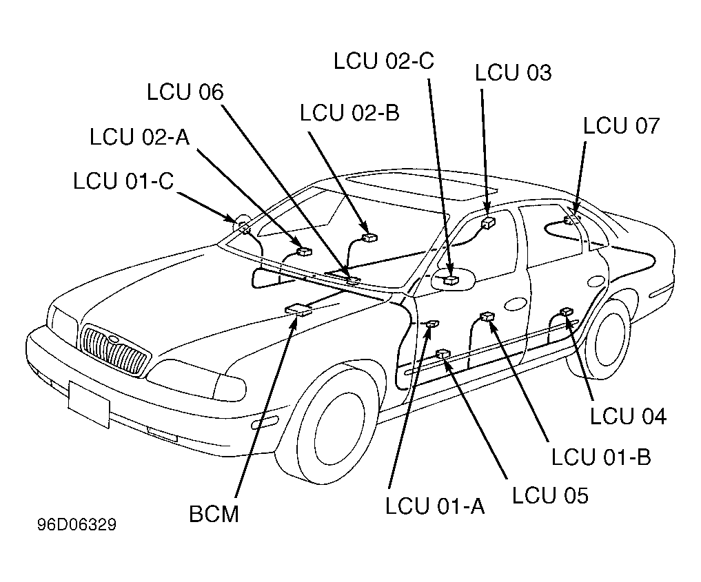 The multiplex control system uses a Body Control Module (BCM) and 11 Local Control Units (LCU's) to manage the following electrical systems in the vehicle: power window control, power door lock control, automatic drive positioner control, power seat control, time control system, anti-theft system, step light control, illumination control, door mirror automatic tilt down reverse control and multi-remote control. See Fig 1 . Some electrical systems are directly connected to the BCM, while some electrical loads and switches are connected to the appropriate LCU.