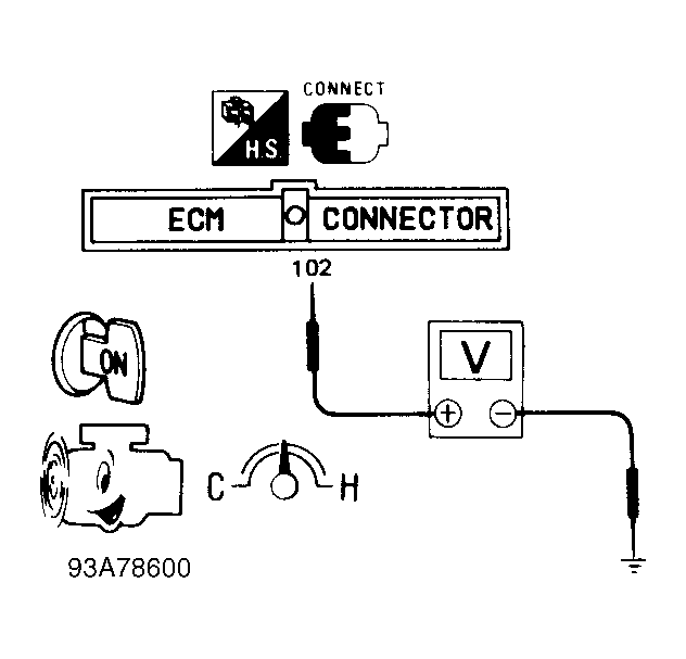 If vacuum is not present, with engine running, measure voltage between ECM terminal No. 102 (Blue/Red wire) and ground. At idle, voltage should be approximately zero volts. At 2000 RPM, voltage should be battery voltage. See Fig 3