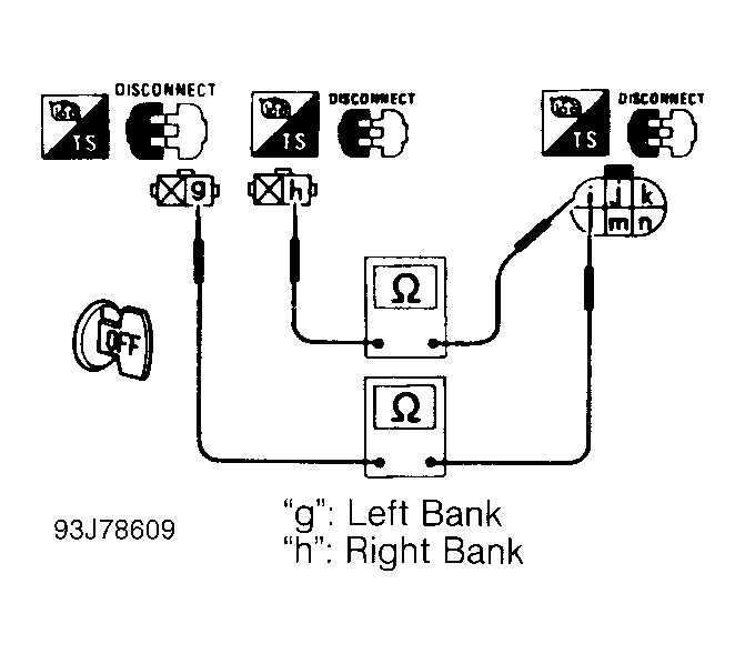 Disconnect knock sensor (left and right) harness connectors. Verify harness continuity between EFI sub-harness terminal "i" and left knock sensor harness connector terminal "g" (White wire) and between EFI sub-harness terminal "l" and right knock sensor harness connector terminal "h" (White wire). If continuity is present, go to next step. If continuity is not present, repair harness or connectors as necessary. See Fig 2