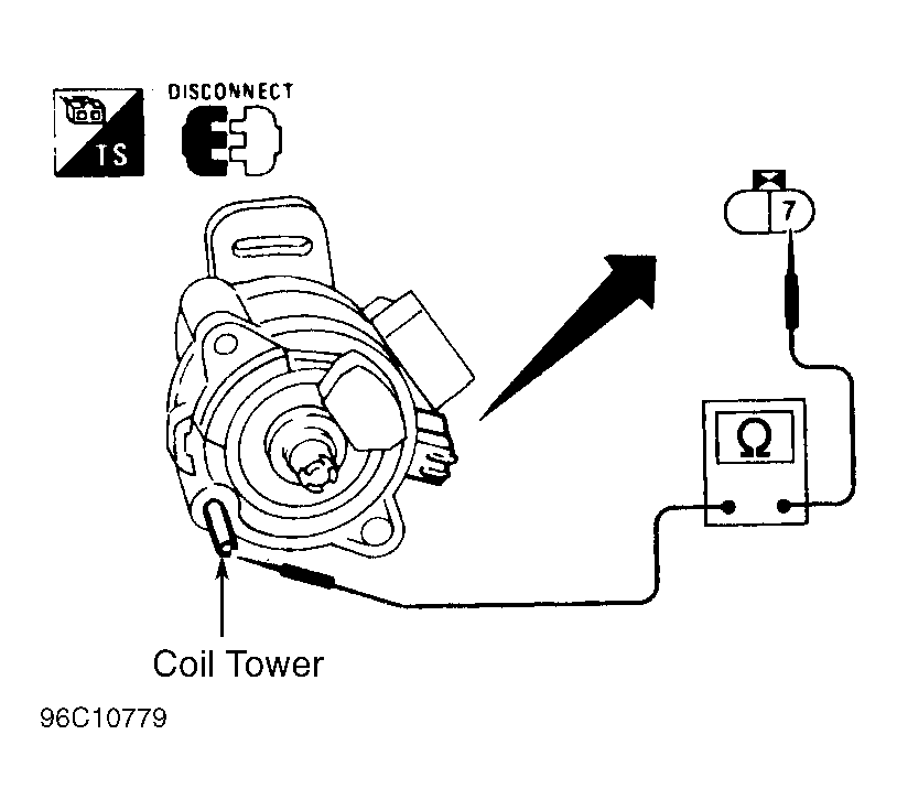 2. Check resistance between ignition coil Black/Red wire terminal and coil tower. See Fig 1 . Resistance should be about 25,000 ohms. If ignition coil resistance is not as specified, replace distributor.