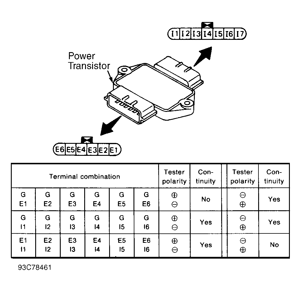 Disconnect power transistor harness connector. Using ohmmeter, check power transistor continuity. See Fig 1 . Replace power transistor if results are not as specified.