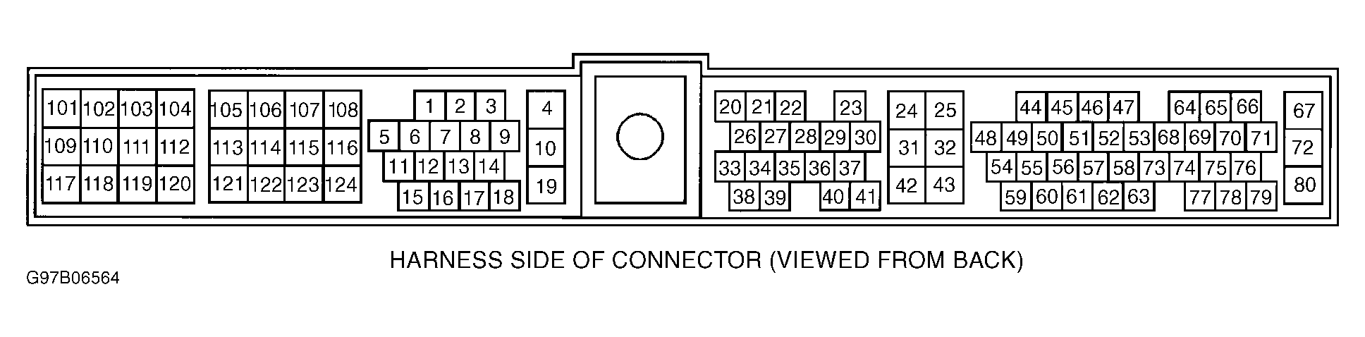 1. Using an ohmmeter, check for continuity to ground on ECM terminals No. 10, 19, 25, 32, 43, 108, 116 and 124. See Figure . Resistance should be zero ohms. If resistance is not zero ohms, repair open to ground.