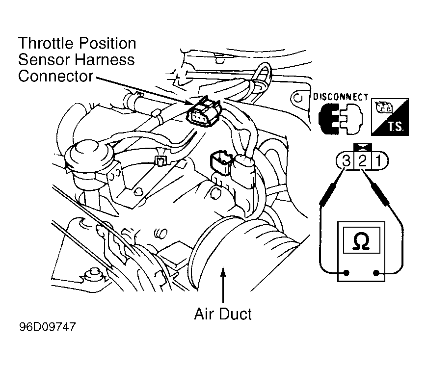 - Ensure engine is warmed to normal operating temperature. Disconnect throttle position sensor harness connector. See Fig 1 or Fig 2