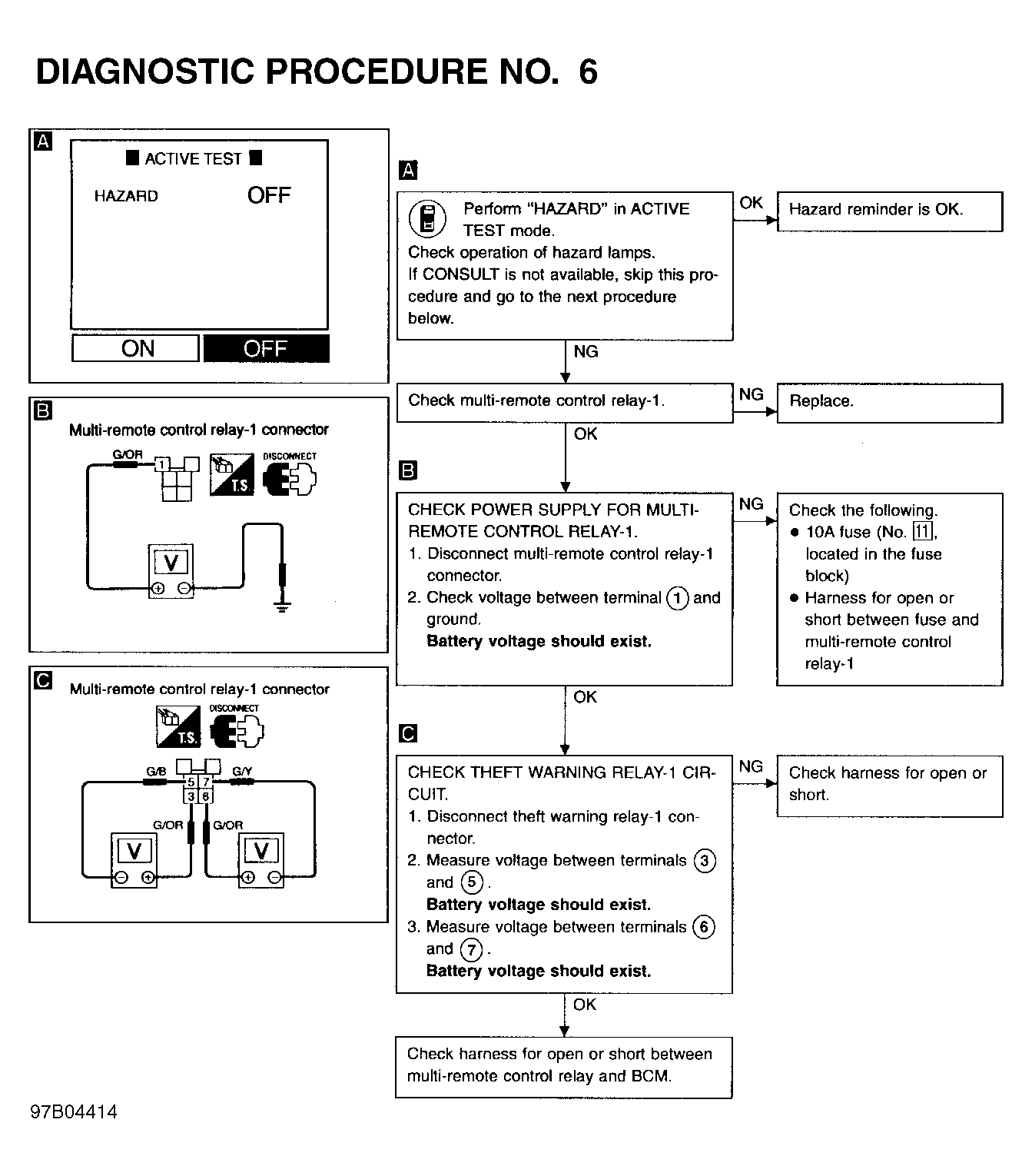 Turn hazard switch on. If hazard lights operate properly, perform diagnostic procedure No. 6. See Figure . If hazard lights do not operate properly, repair hazard lights. See appropriate wiring diagram in EXTERIOR LIGHTS article.
