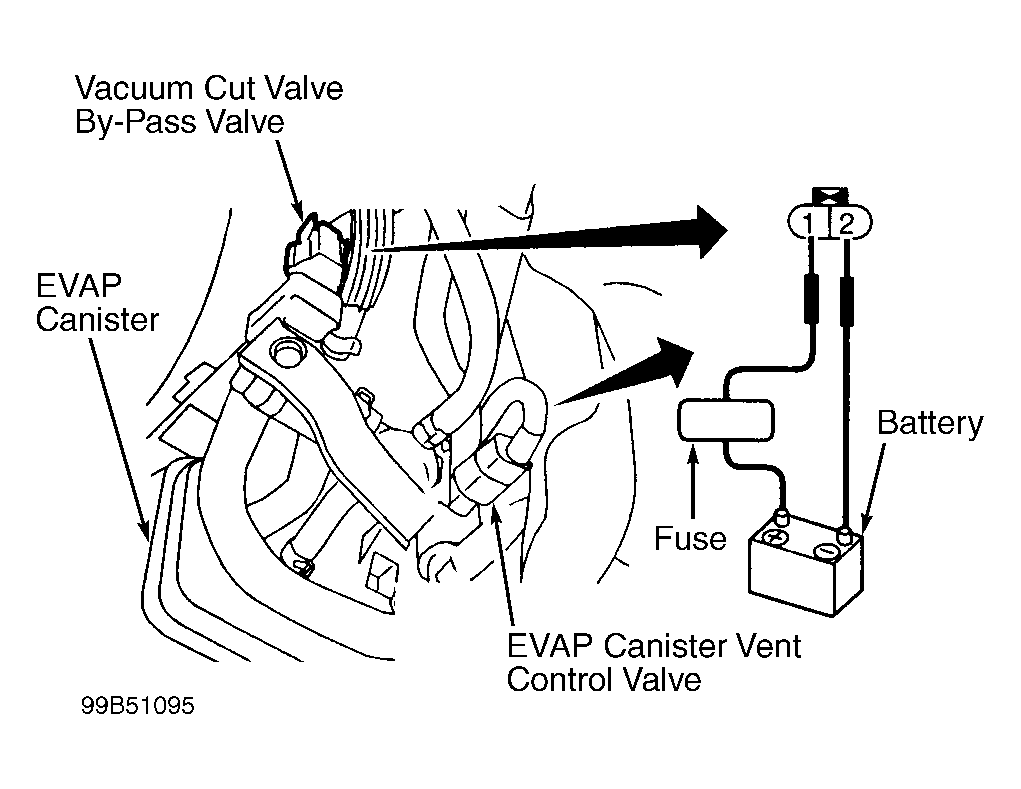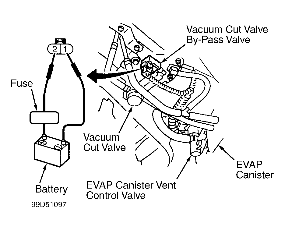 Connect suitable pressure pump with gauge to EVAP service port. See VACUUM DIAGRAMS article for location. Using jumper wires, apply battery voltage to EVAP Canister Vent Control Valve (EVAP-CVCV) and Vacuum cut valve by-pass valve. See Fig 1, Fig 2, or Fig 3 . Apply.2-.4 psi (1.38-2.76 kPa) of pressure to EVAP service port. Remove pressure pump from EVAP service port. Using Leak Detector (J41416), locate EVAP system leak.